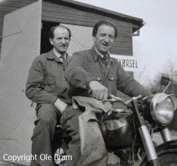 Scenearbejderne Lars og Ole Olesen på fotografassistent Ole Brams motorcykel: