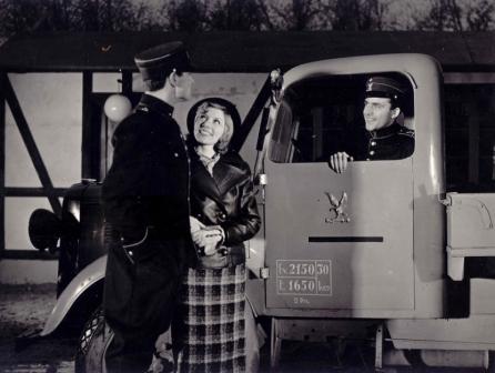 Bruno Nørdam har sendt mig følgende billede fra sin samling. Karen Jønsson med rødt hår og regnfrakke i "Alarm" sammen med Poul Reichhardt og Lau jun.: